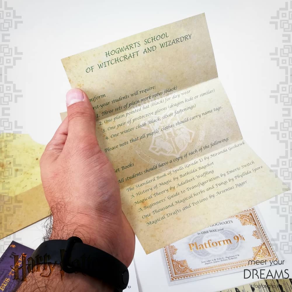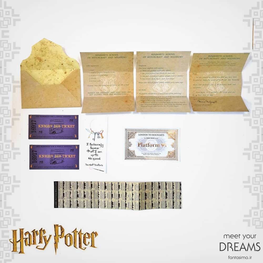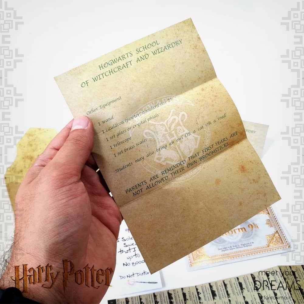 این نامه شامل 3 صفحه دعوت نامه ملزومات و موارد دیگر می باشد و همچنین 1 بلیط سکوی 3/4 طلاکوب - برای سفر به هاگوارتز . موارذ دیگری که شما می توانید داخل نامه ببینید سه برگه عنوان جادو ها (استفاده از جادو ها در دنیای مشنگ ها مجاز نمی باشد) ، 2 بلیط اتوبوس شوالیه و یک آویز در کاغذی هستند.