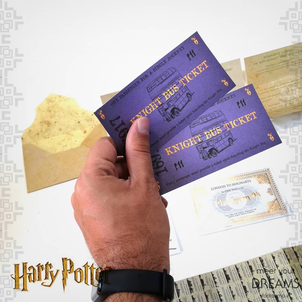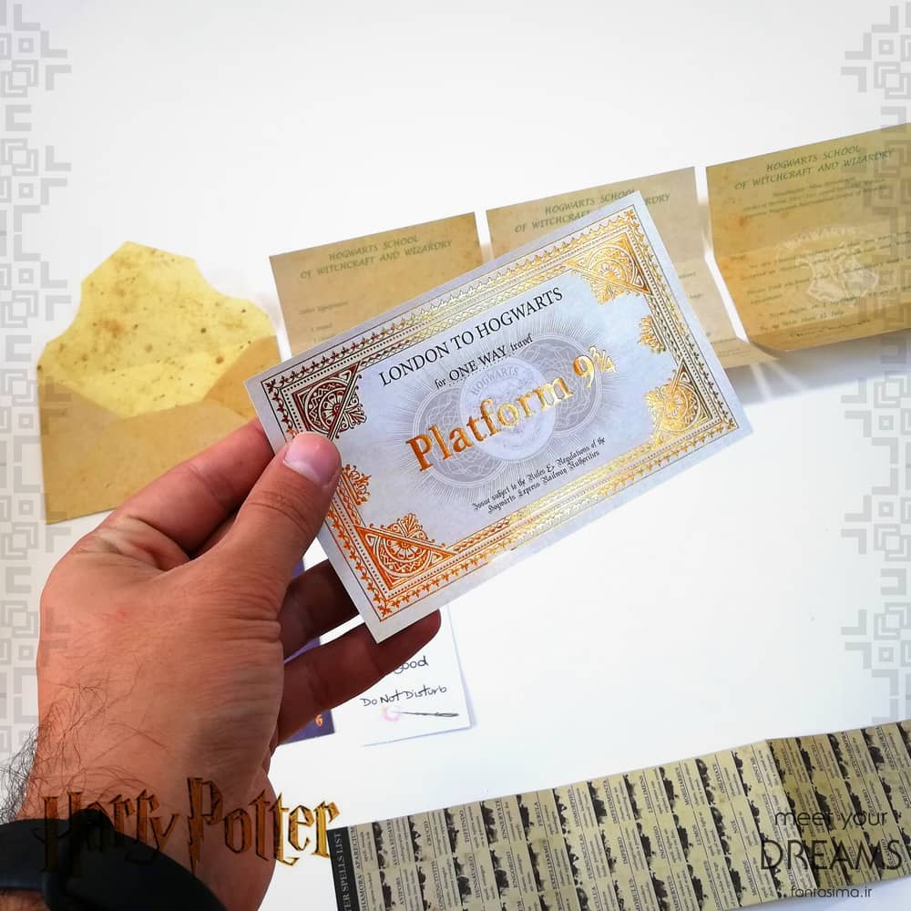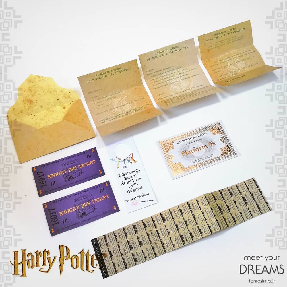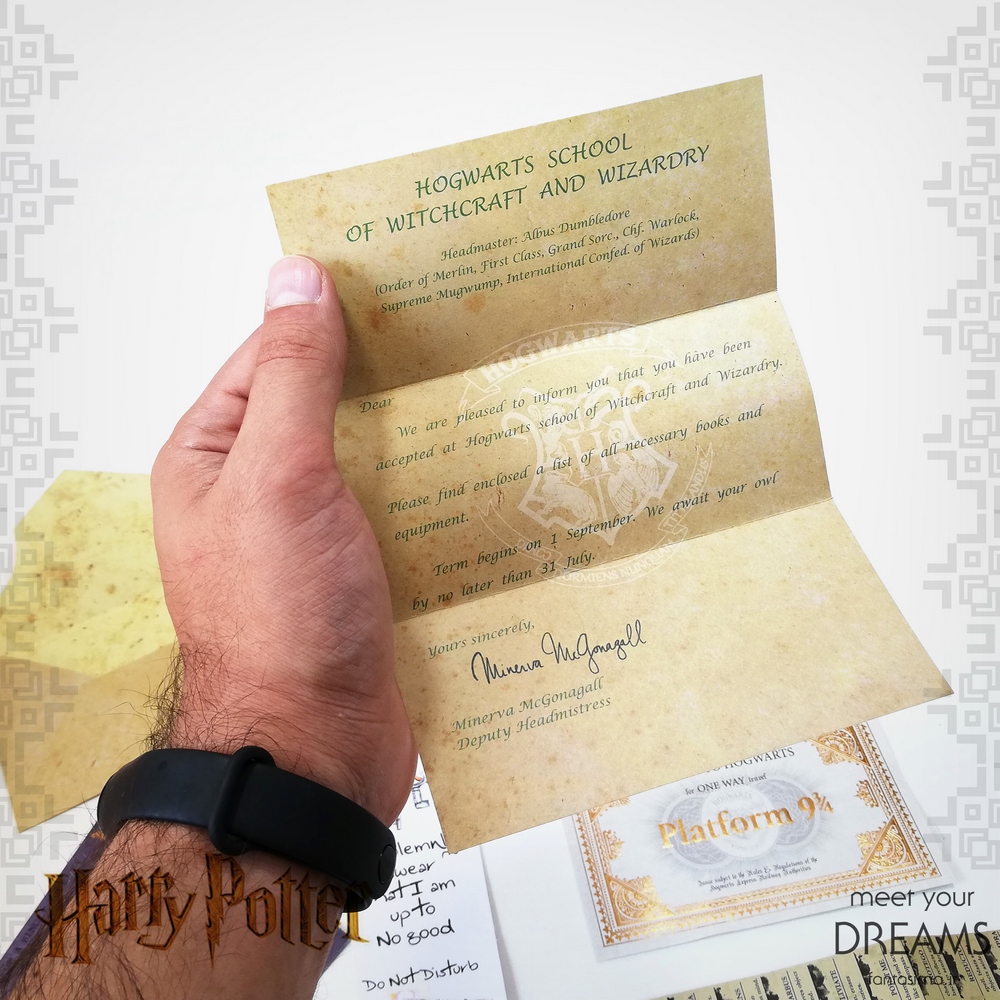 این نامه شامل 3 صفحه دعوت نامه ملزومات و موارد دیگر می باشد و همچنین 1 بلیط سکوی 3/4 طلاکوب - برای سفر به هاگوارتز . موارذ دیگری که شما می توانید داخل نامه ببینید سه برگه عنوان جادو ها (استفاده از جادو ها در دنیای مشنگ ها مجاز نمی باشد) ، 2 بلیط اتوبوس شوالیه و یک آویز در کاغذی هستند.
